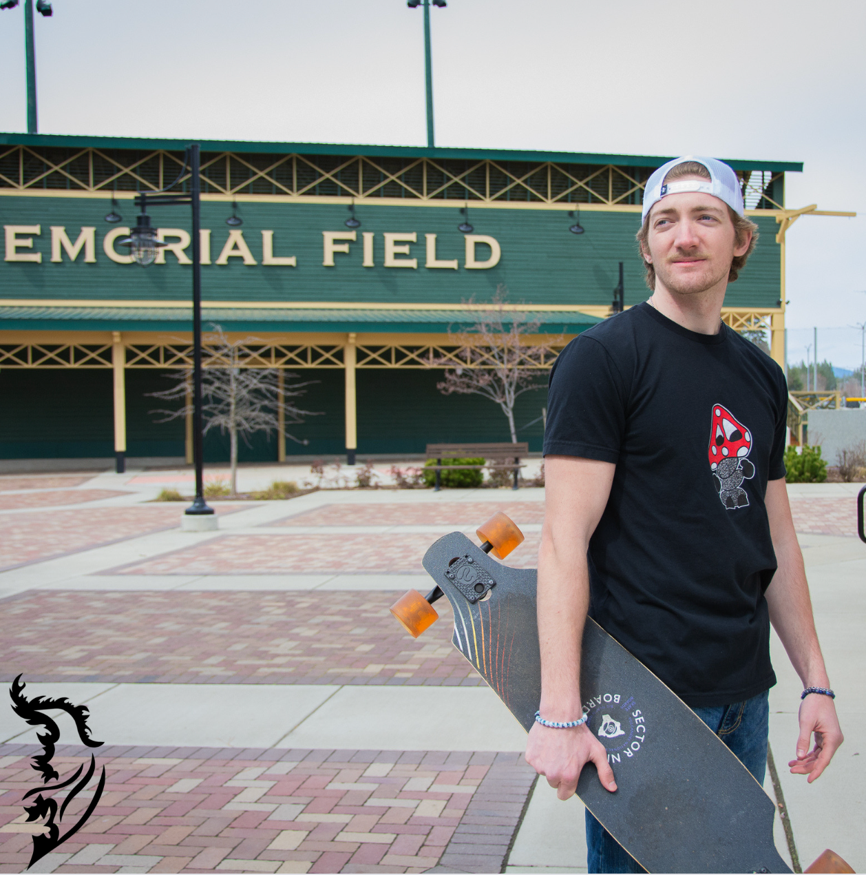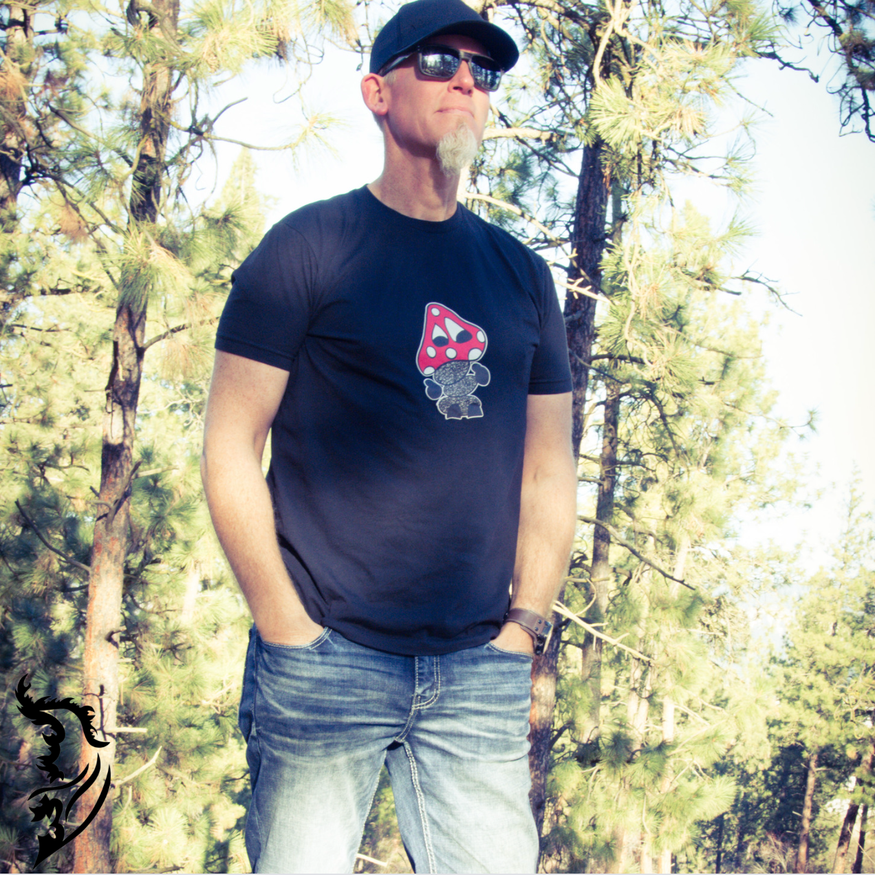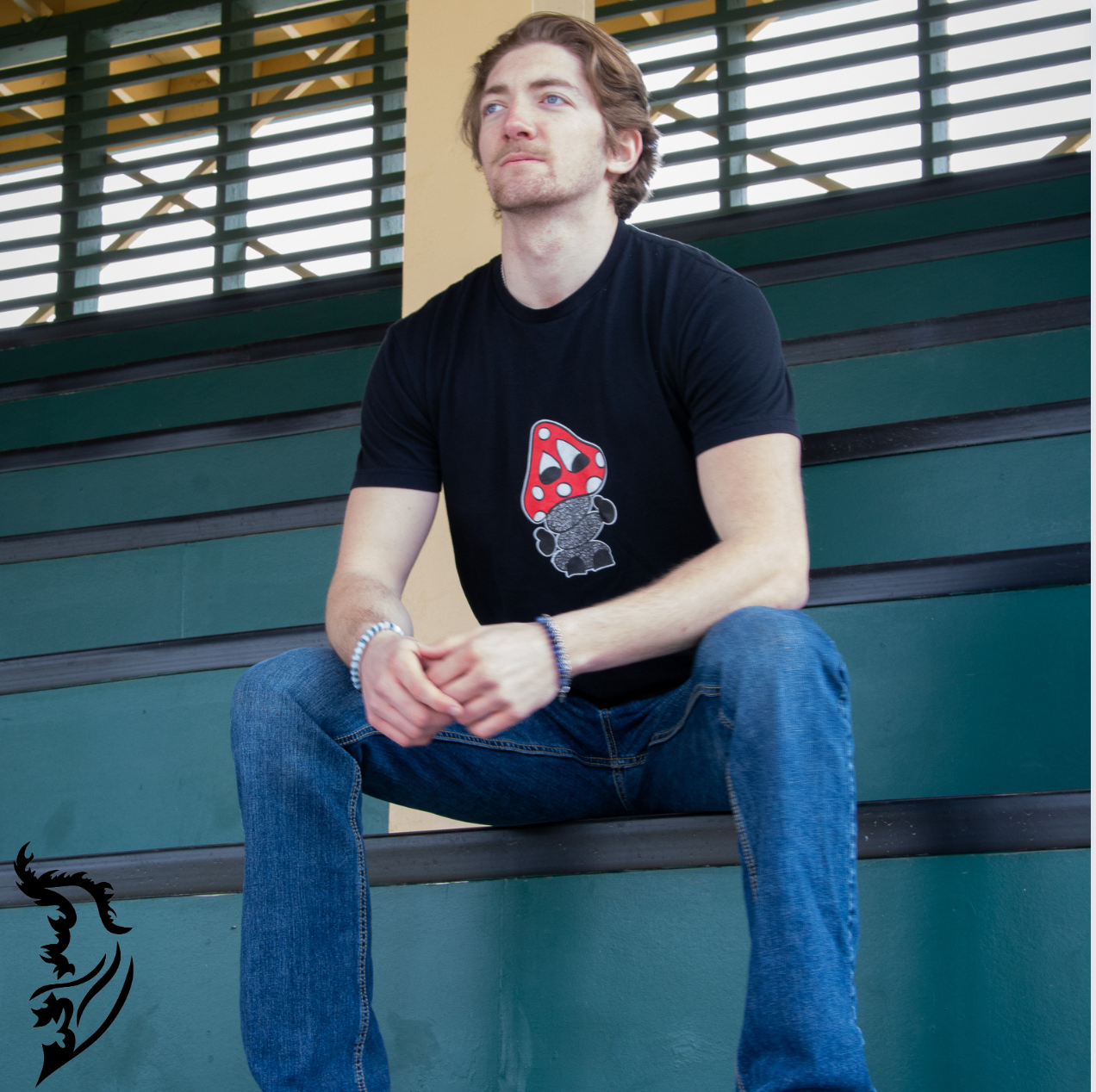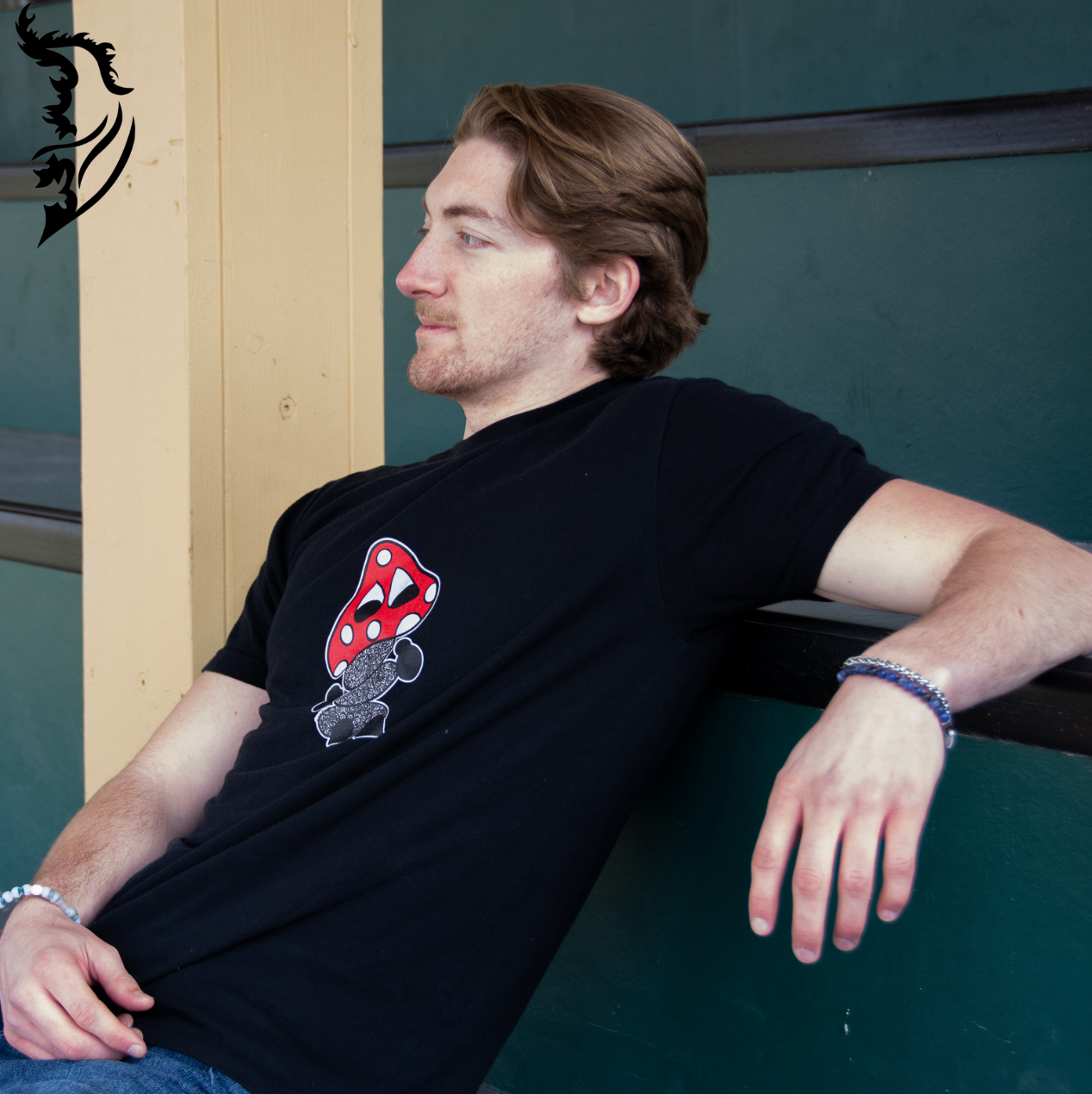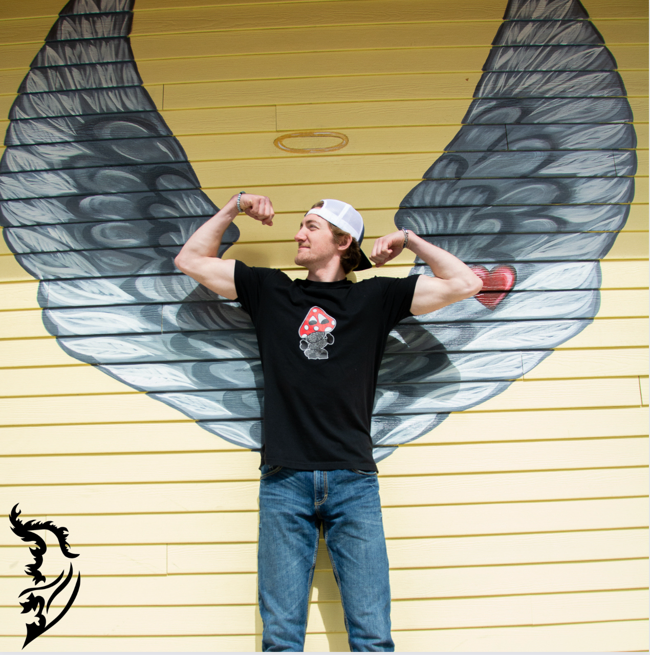 Black T-Shirt with Fun Guy design on front center chest. Angel Wing logo on back right bottom of shirt.