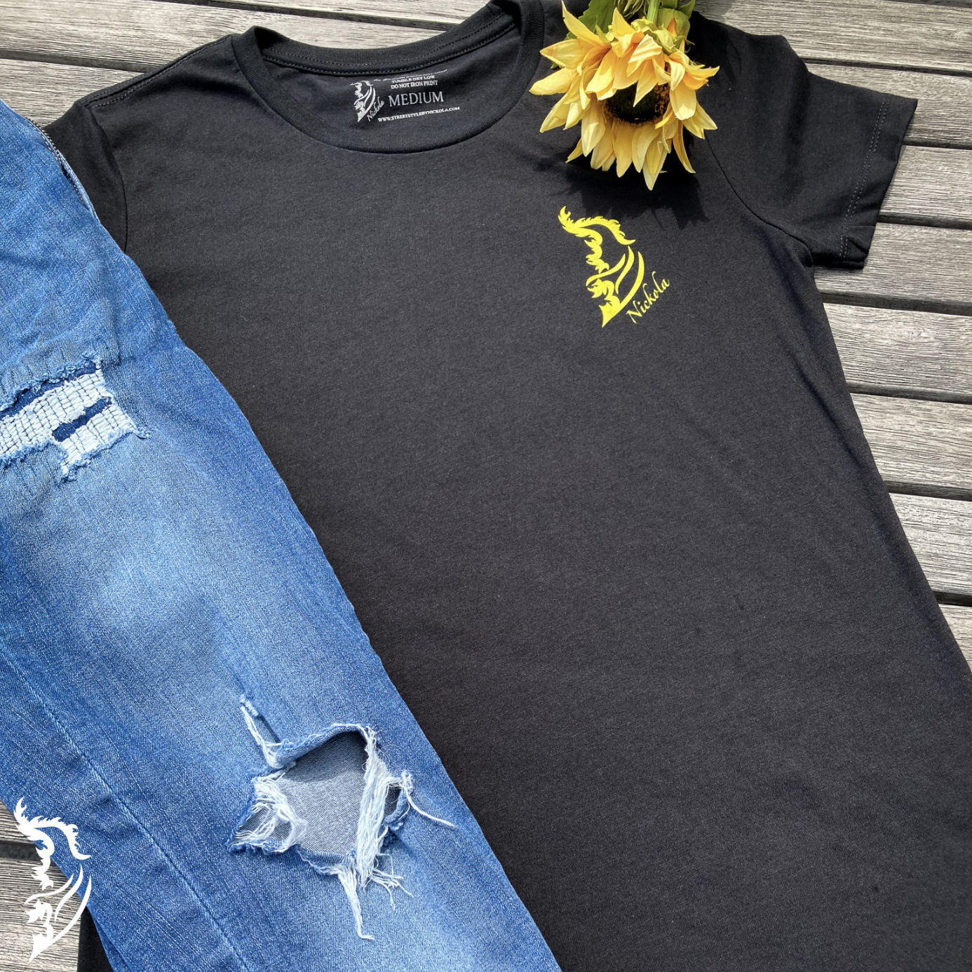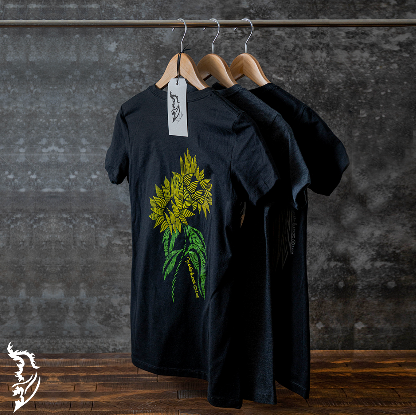 Sunflower Design on back, Angel Wing logo on left chest, Available in Crew or V-neck