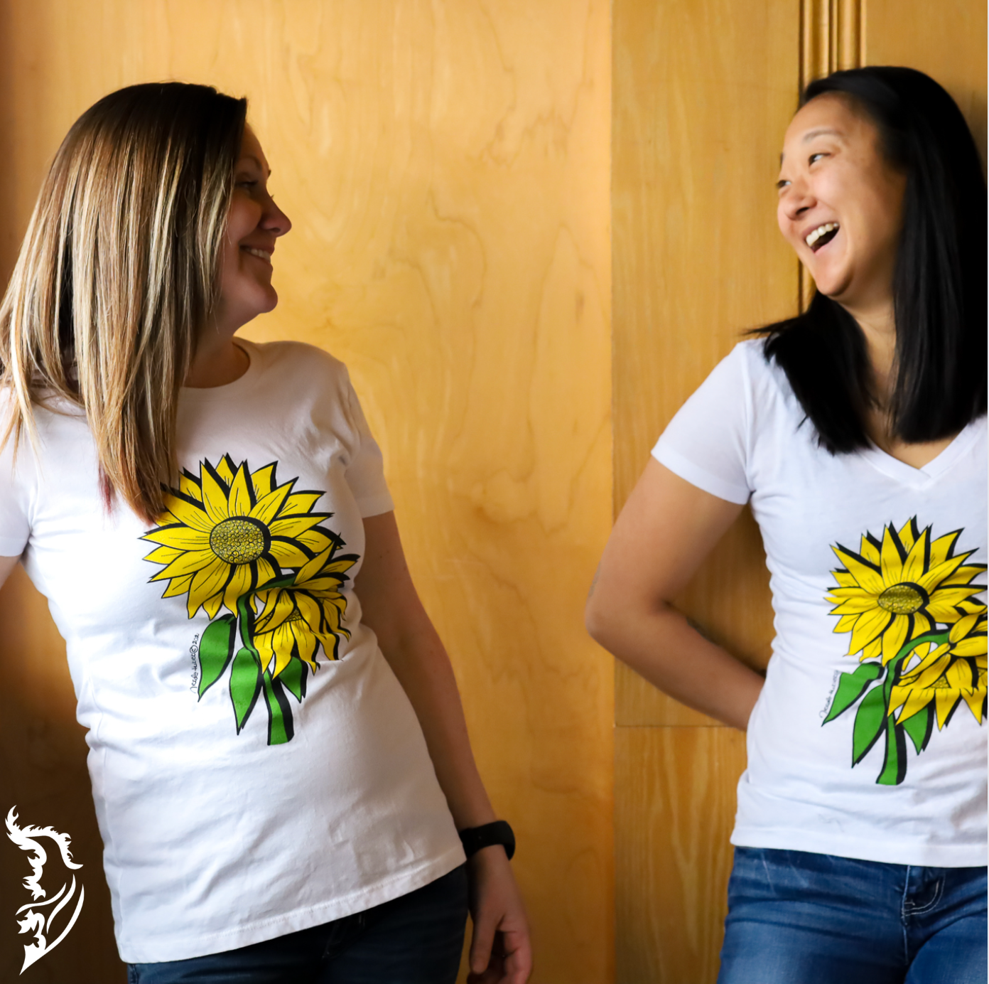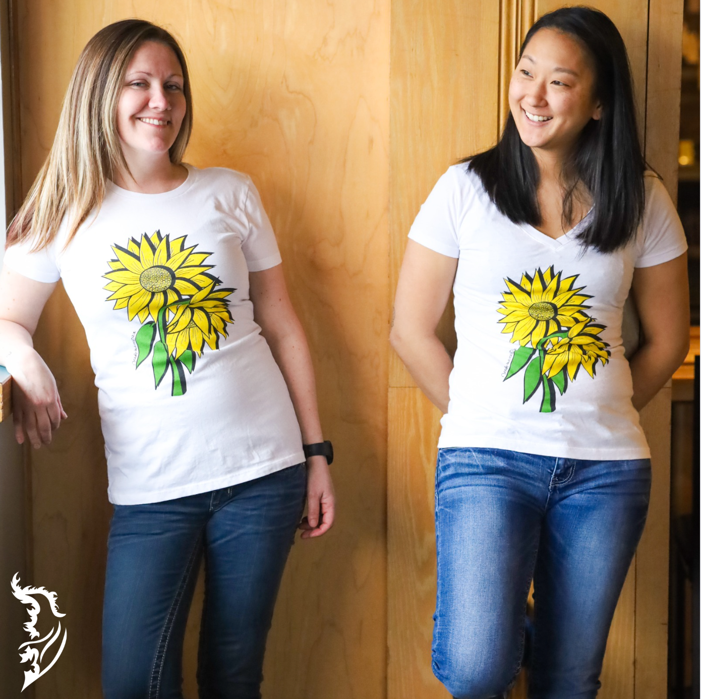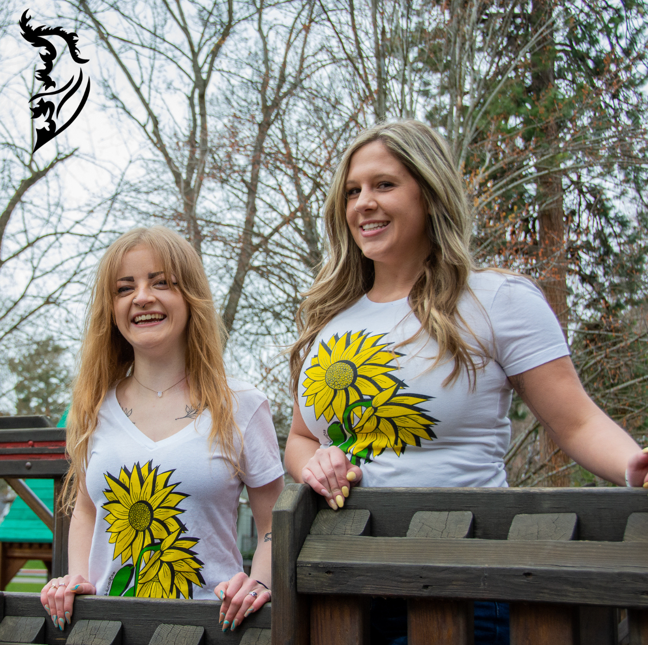 Sunflower Design on front center, Angel Wing logo on back right corner, Available in Crew or V-neck