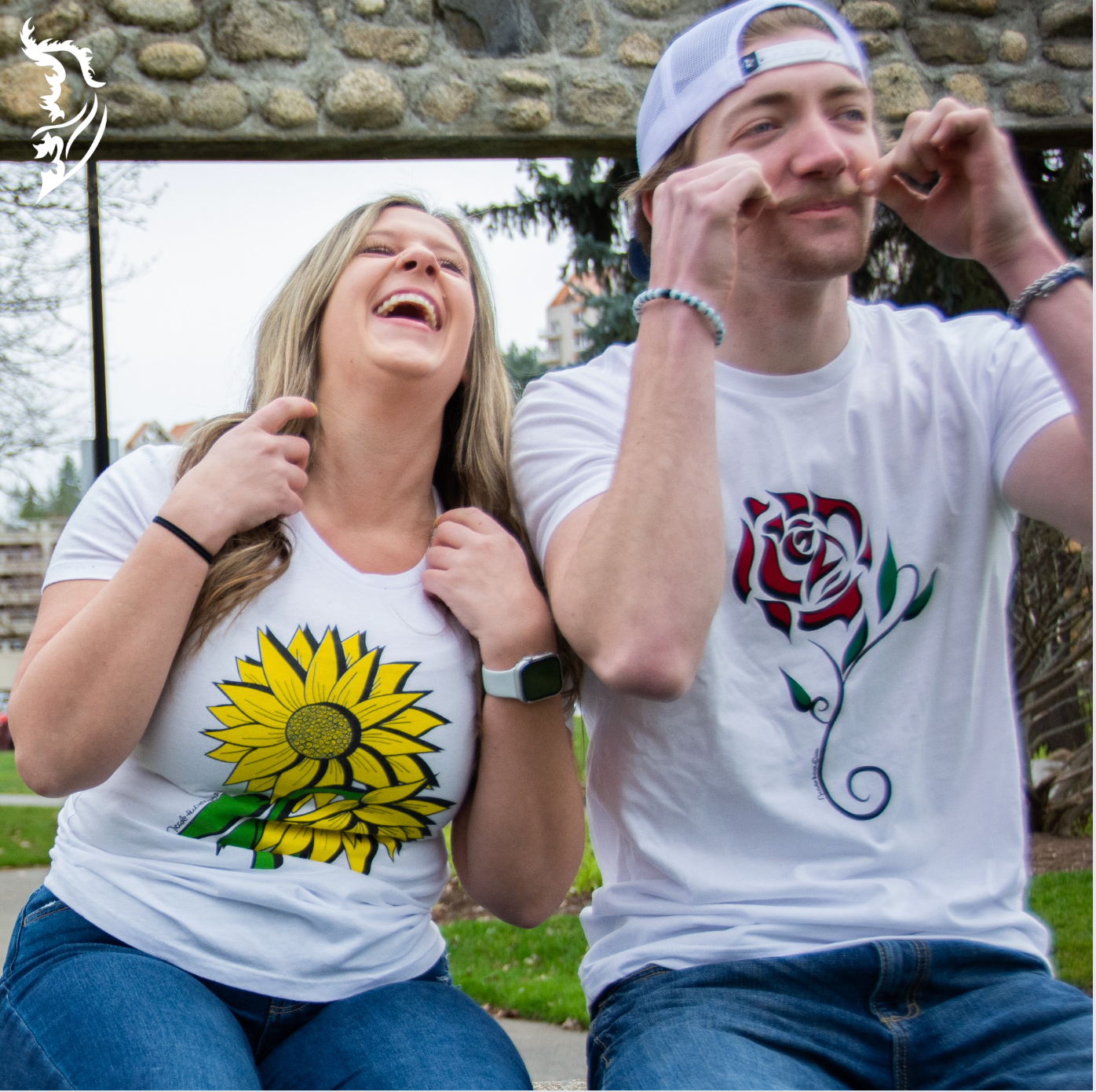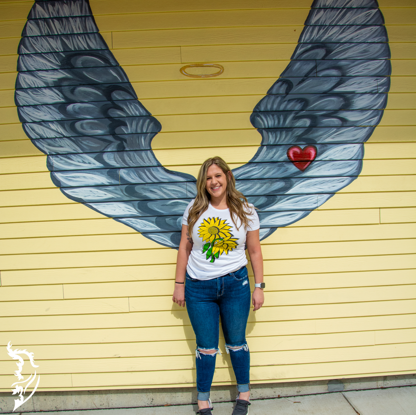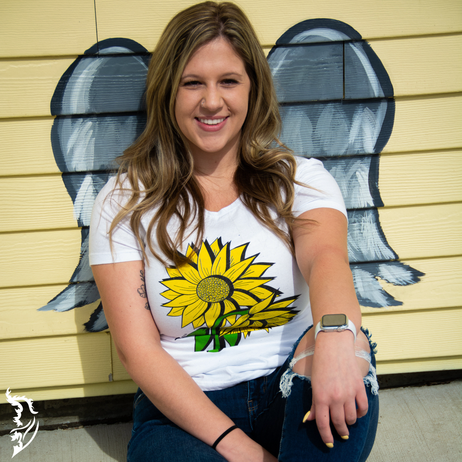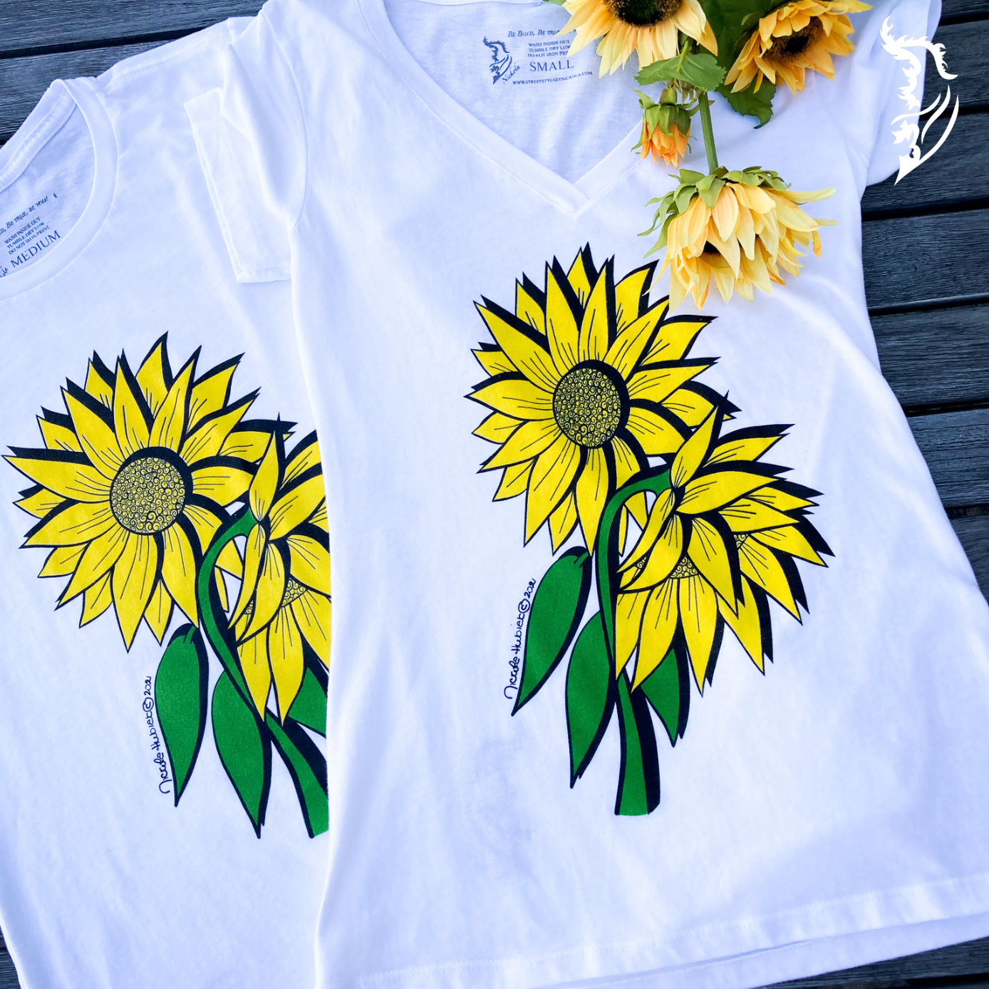 Sunflower Design on front center, Angel Wing logo on back right corner, Available in Crew or V-neck