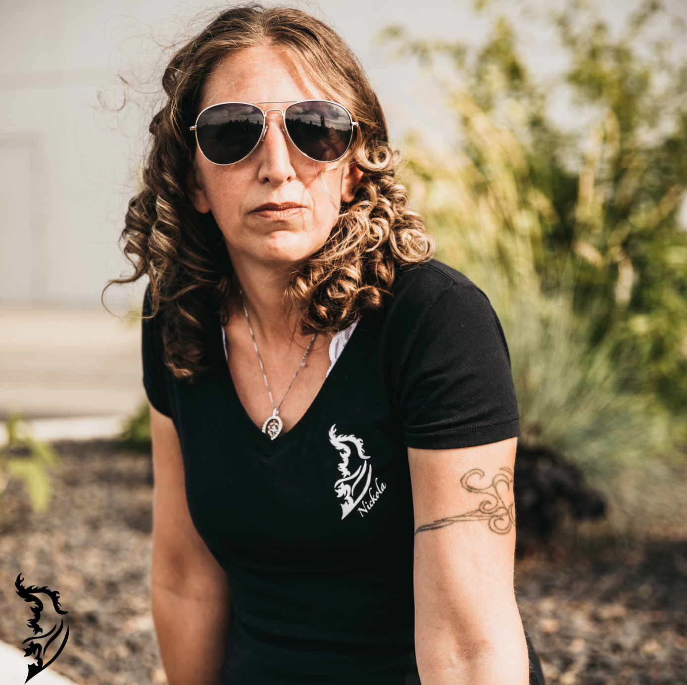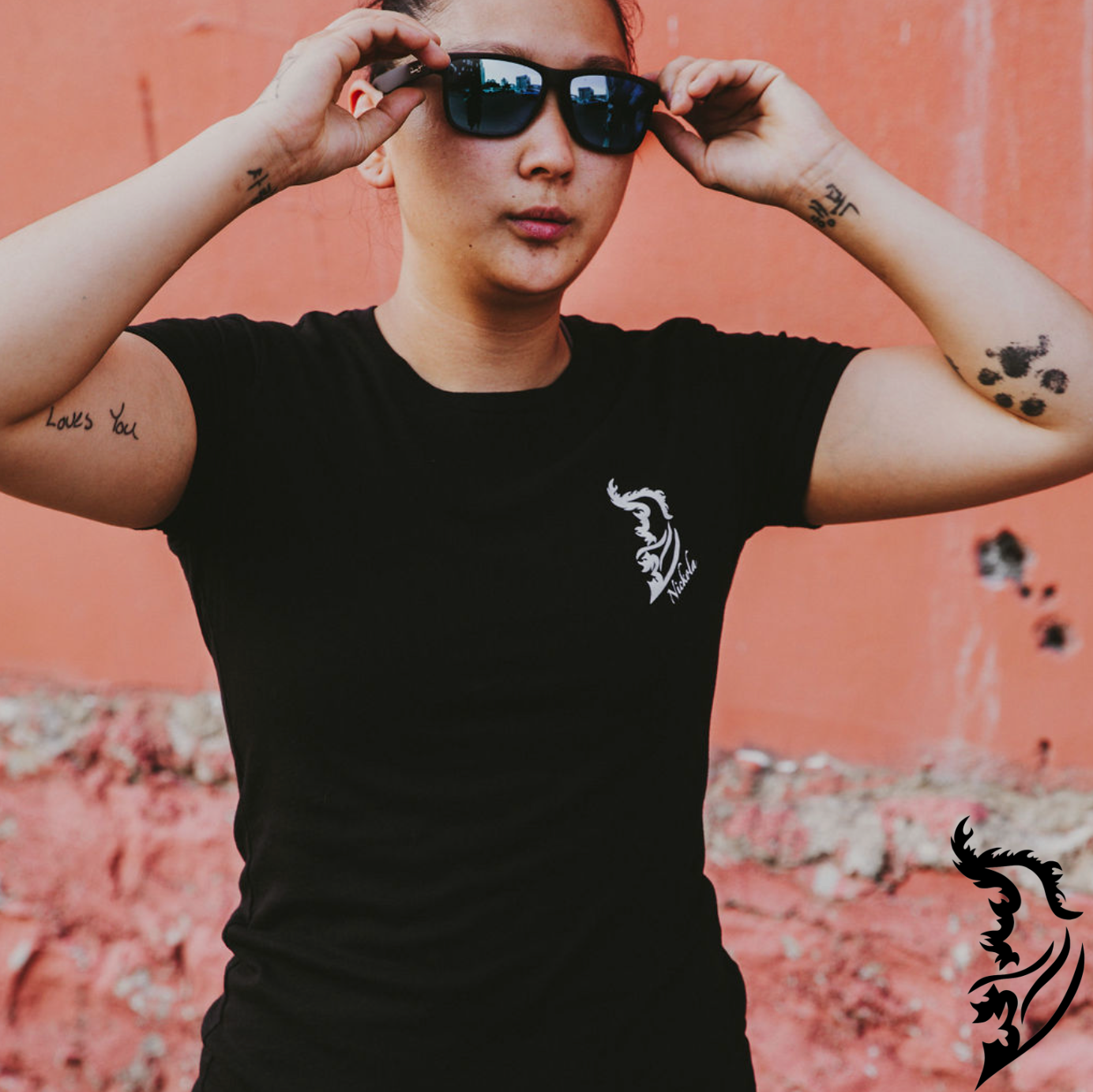 Black T-Shirt, Design on back, Angel Wing logo on front left chest. Available in V-neck or Crew
